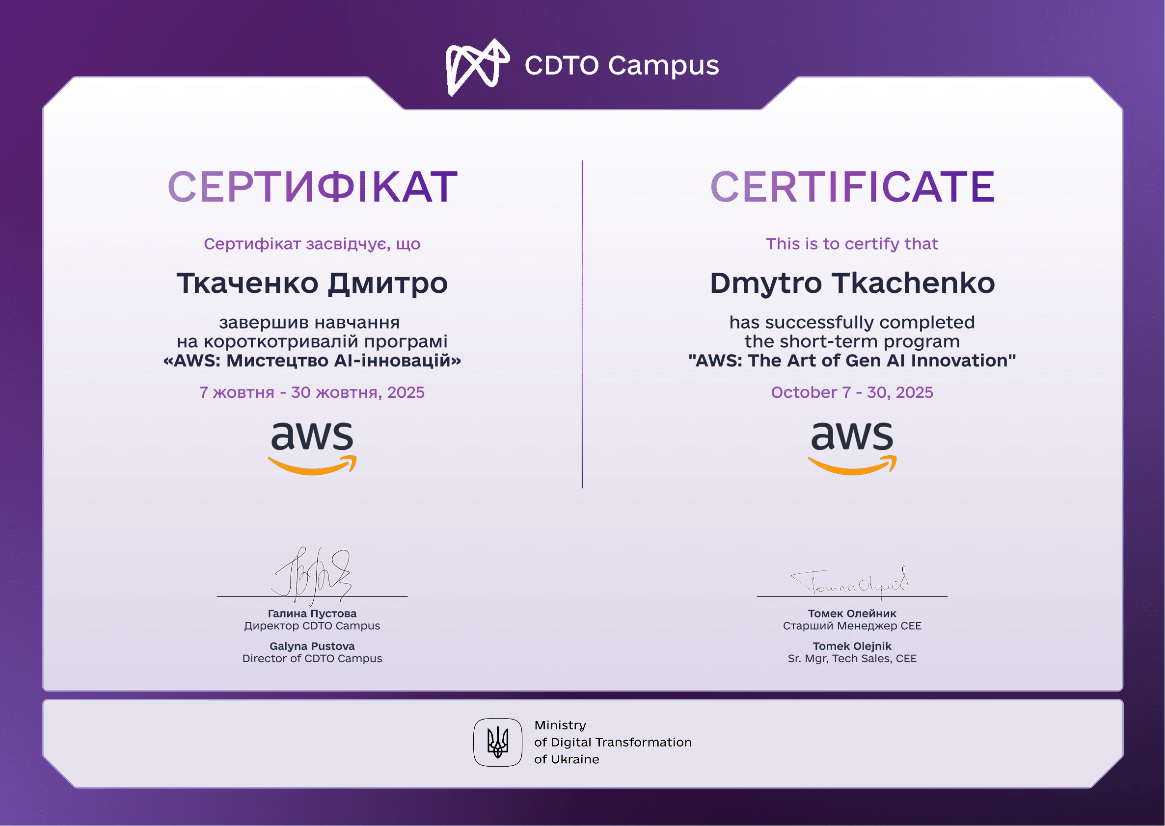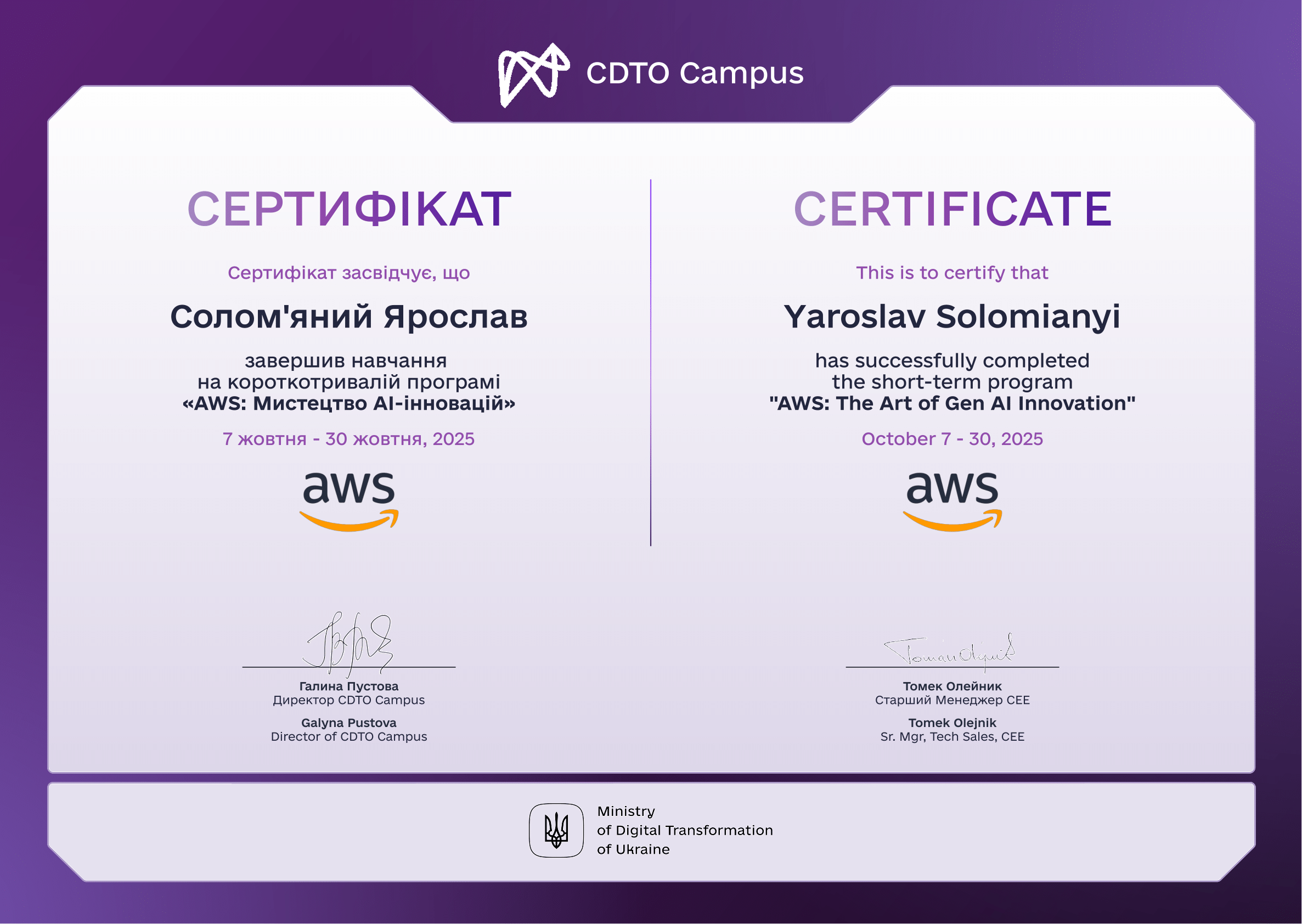 Начальник відділу цифрової трансформації Ярослав Солом’яний та програміст Ткаченко Дмитро успішно завершили навчання за спеціалізованою програмою «AWS: Мистецтво AI-інновацій», що реалізується на базі CDTO Campus.