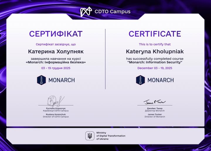 Протягом навчання директор поглибила знання з питань захисту інформації, кібербезпеки та сучасних підходів до управління інформаційними ризиками – тем, які сьогодні є критично важливими як для публічного сектору, так і для органів місцевого самоврядування.